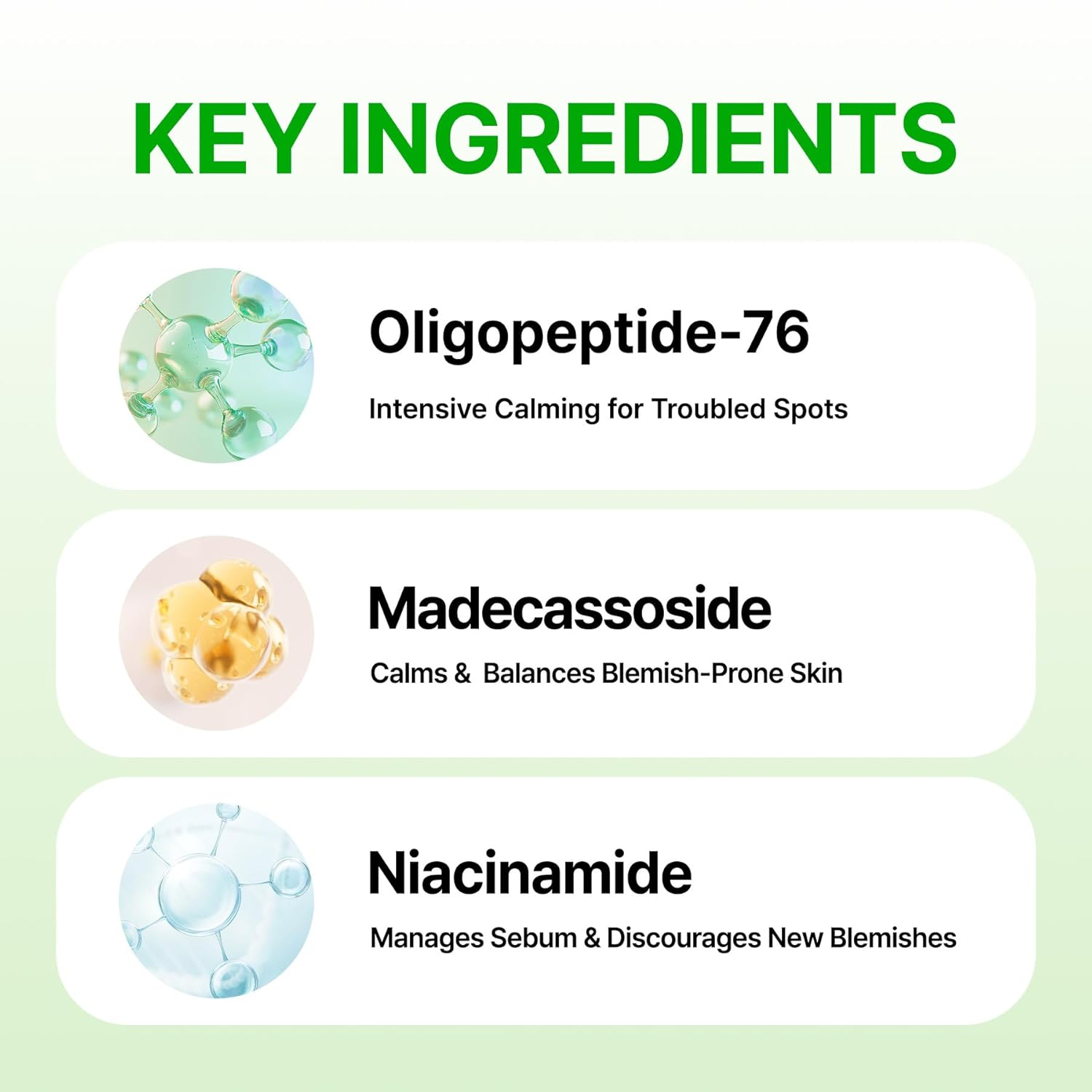 - Infused with Oligopeptide-76 and Madecassoside to soothe irritation, calm inflammation, and accelerate skin recovery.