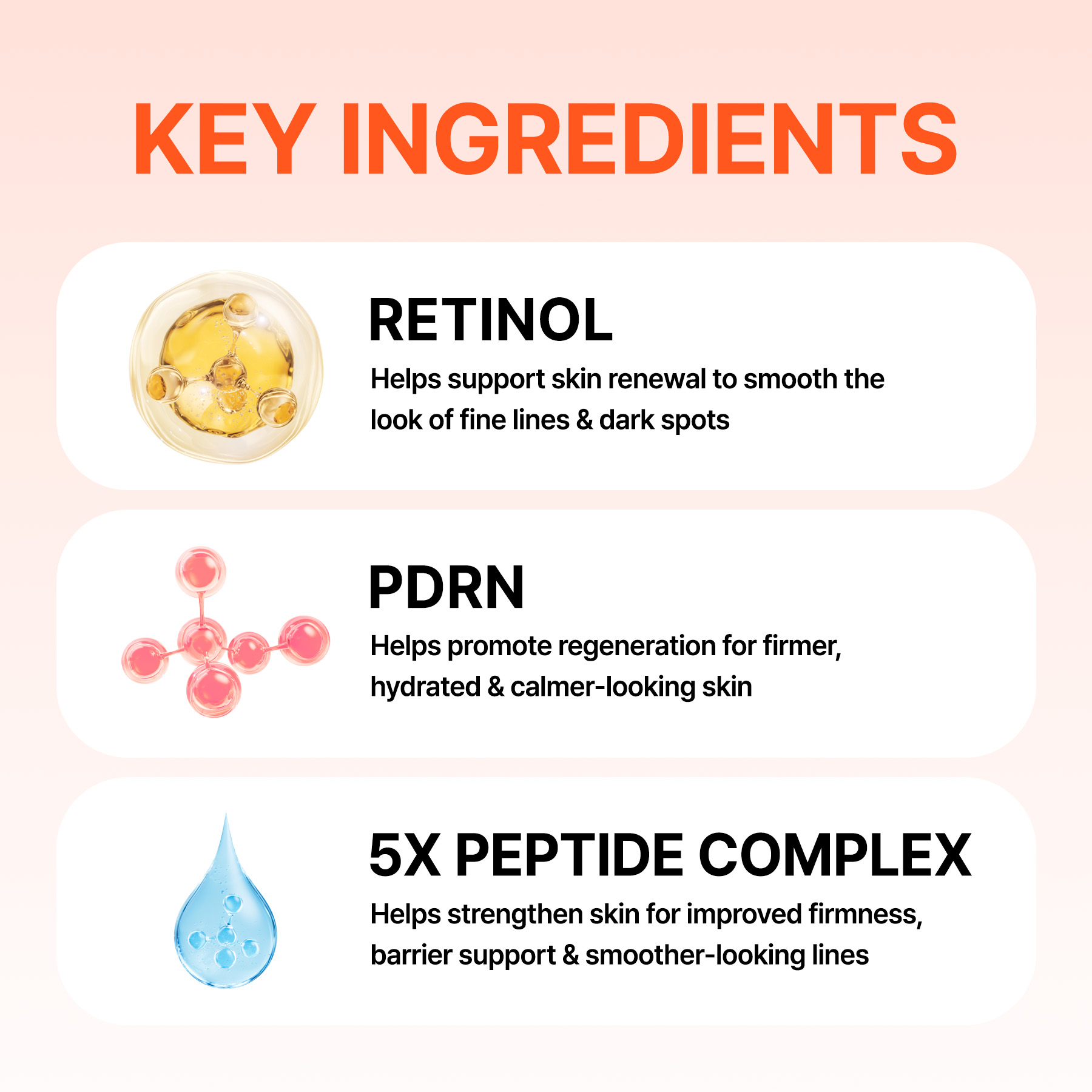 - Infused with 5 types of Peptides to enhance skin elasticity and promote firmness, helping to reduce the appearance of fine lines for a more youthful complexion.