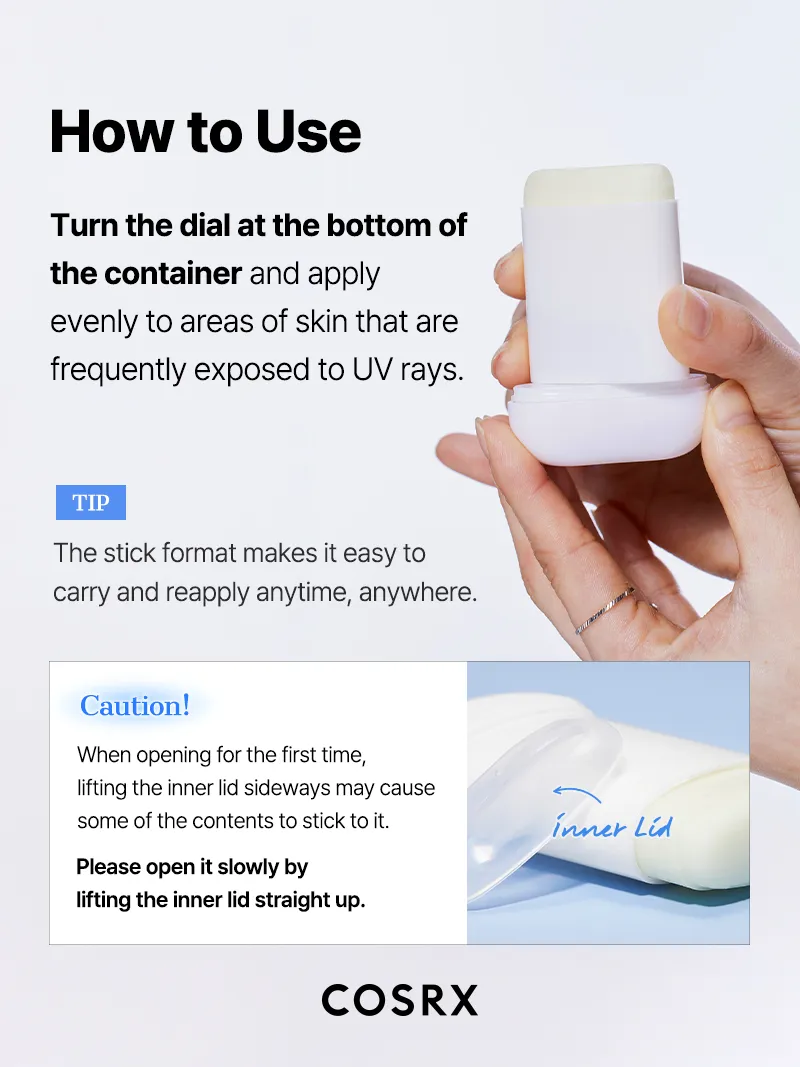 - Turn the dial at the bottom of the container and apply evenly to areas of skin that are frequently exposed to UV rays.