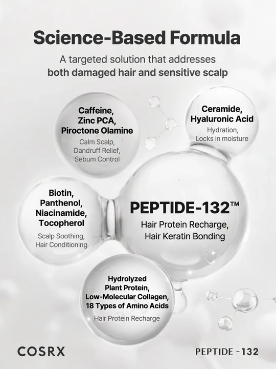 A bond-repair shampoo that gently cleanses while strengthening damaged strands with patented PEPTIDE-132™. Infused with scalp-soothing ingredients like Piroctone Olamine, Zinc PCA, and Caffeine to address flakes, oiliness, and irritation. The rich lather cleanses thoroughly without residue, leaving both scalp and hair feeling fresh and soft. With a mildly acidic pH, it supports a healthy scalp barrier for all hair types.