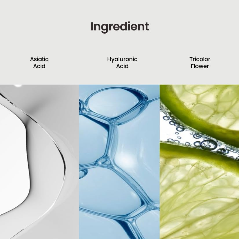 Water, Propanediol, Glycerin, 1,2-Hexanediol, C12-14 Pareth-12, Hydroxyacetophenone, Ethylhexylglycerin, Butylene Glycol, Dipropylene Glycol, Disodium EDTA, Zea Mays (Corn) Kernel Extract, Hydrogenated Lecithin, Polyglyceryl-10 Oleate, Asiaticoside, Madecassic Acid, Asiatic Acid, Fructan, Glucose