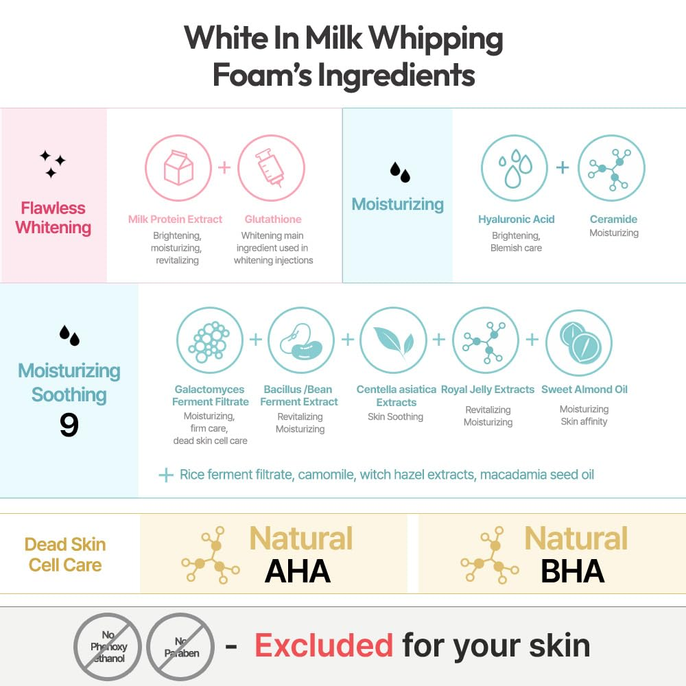 White Milk, Linseed, Niacinamide, Royal Jelly, Ceramide, Glycolic Acid, Glutathione.