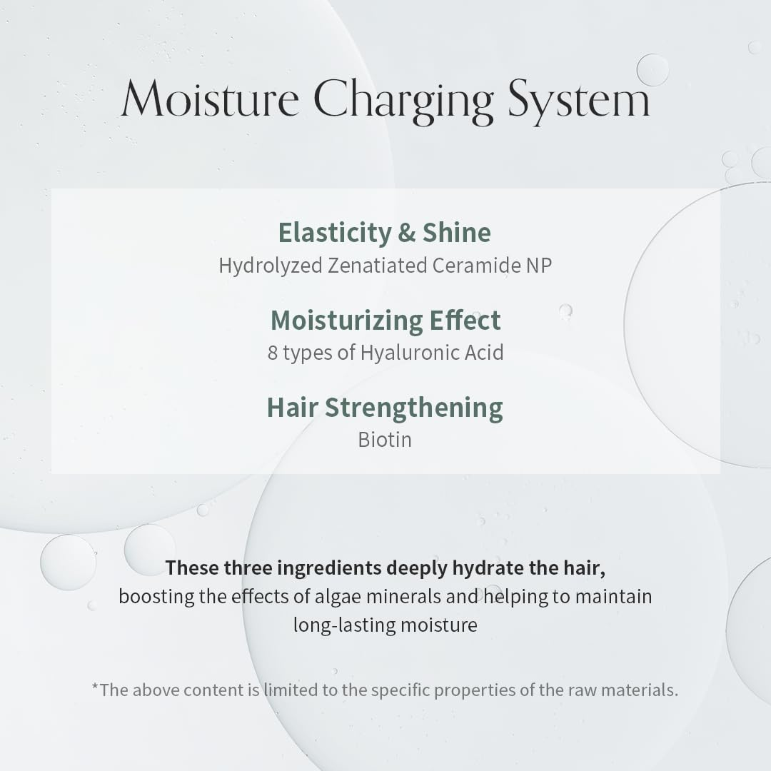 Water, Glycerin, Caprylic/Capric Triglyceride, Isopropyl Myristate, Cetearyl Alcohol, Behenyl Alcohol, Steartrimonium Chloride, FRAGRANCE, Sorbitan Stearate, 1,2-Hexanediol, Propylene Glycol, Caprylyl Glycol, Propanediol, PEG-90M, Polyquaternium-22, Butylene Glycol, Polyquaternium 10, Sodium Citrate, Sucrose Cocoate, Citric Acid, Melia Azadirachta Leaf Extract, Silica, Melia Azadirachta Flower Extract, Sodium chloride, Sodium acetate, Hydrolyzed Sodium Hyaluronate, Isopropyl alcohol, Biotin, Ethylhexylglycerin, Hydrolyzed Hyaluronic Acid, Hydroxypropyltrimonium Hyaluronate, Tocopherol, Hydrogenated Lecithin, Sodium Acetylated Hyaluronate, Undaria Pinnatifida Extract, Laminaria Japonica Extract, Hizikia Fusiforme Extract, Codium Fragile Extract, Sodium Hyaluronate Crosspolymer, Ecklonia Cava Extract, Ceramide NP, Hyaluronic Acid, Hydrolyzed Oyster Extract, Plankton Extract, Potassium Hyaluronate, Salicornia Herbacea Extract, Chlorella Vulgaris Extract, Sodium Hyaluronate, Fucus Vesiculosus Extract, Sodium DNA, Lactobacillus Ferment, Phaseolus Angularis Seed Extract