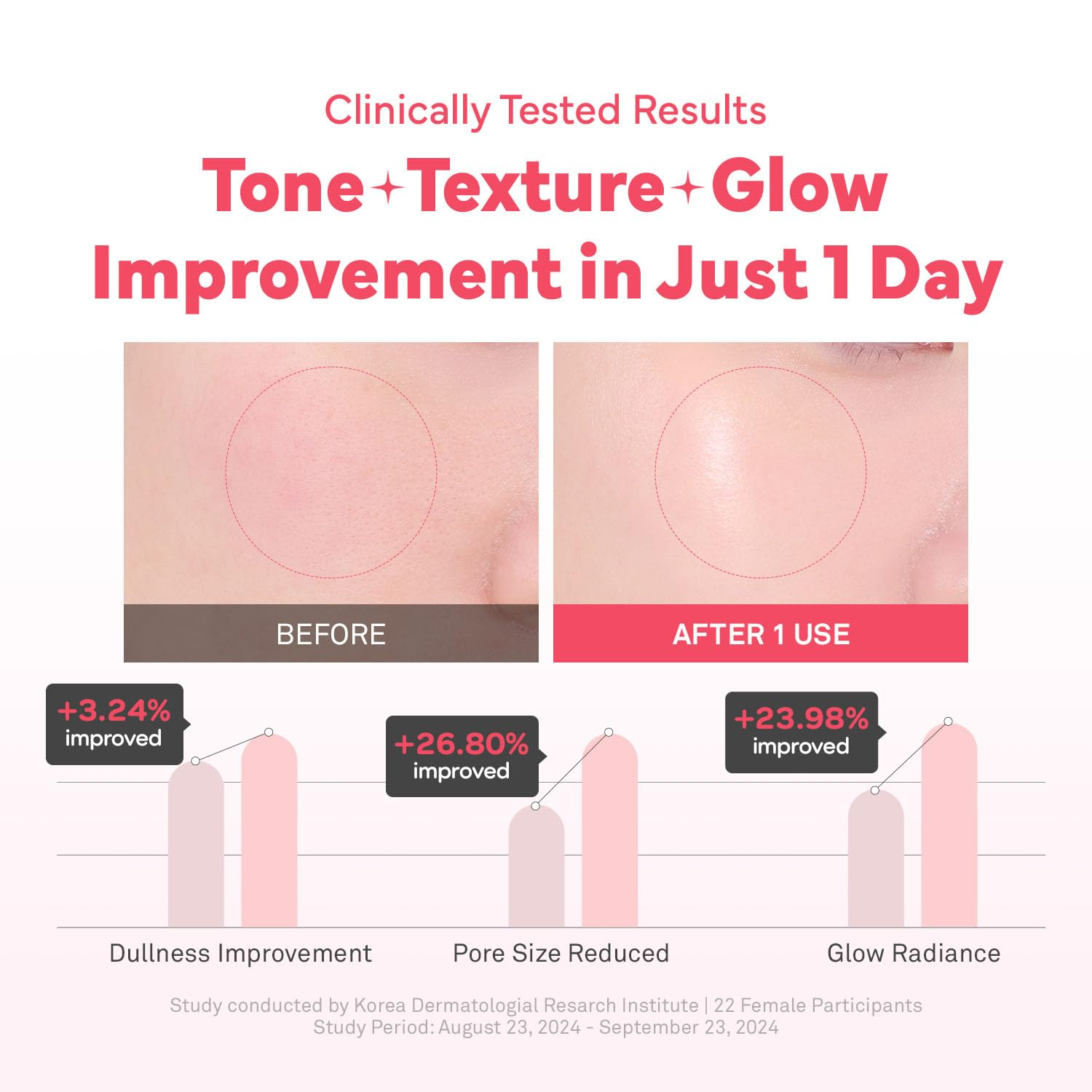 Fragaria Ananassa (Strawberry) Fruit Water, Glycerin, Water, Vinyl Dimethicone, Butylene Glycol, 1,2-Hexanediol, Dipropylene Glycol, Niacinamide, Pentylene Glycol, Diglycerin, Pentaerythrityl Tetraethylhexanoate, Laminaria Japonica Extract, Eclipta Prostrata Leaf Extract, Carthamus Tinctorius (Safflower) Flower Extract, Gardenia Florida Fruit Extract, Ficus Carica (Fig) Fruit Extract, Centella Asiatica Extract, Morus Alba Root Extract, Hydrogenated Lecithin, Panthenol, Ammonium Acryloyldimethyltaurate/VP Copolymer, Acrylates/C10-30 Alkyl Acrylate Crosspolymer, Tromethamine, Hydroxyacetophenone, Ethylhexylglycerin, Chondrus Crispus Powder, Adenosine, Agar, Sodium Phytate, Dextrin, Fructooligosaccharides, Cyanocobalamin, Beta-Glucan, Titanium Dioxide, Hydrolyzed Hyaluronic Acid, Ceramide NP, Tocopherol, Citric Acid, 3-O-Ethyl Ascorbic Acid, Propanediol, Hydroxypropyl Cyclodextrin, Caprylic/Capric Triglyceride, Sucrose Distearate, Fragrance, Helindone Pink CN, Iron Oxide Yellow