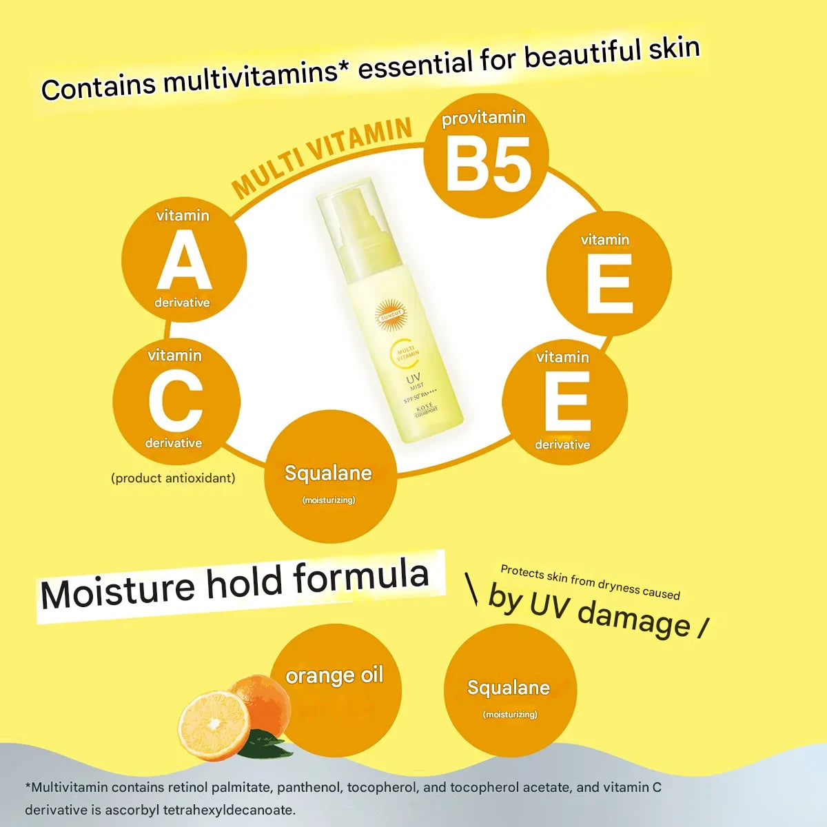 Ethanol, Propylene Glycol Dicaprylate/Dicaprate, Diethylhexyl Succinate, Ethylhexyl Methoxycinnamate, C12-15 Alkyl Benzoate, Ethylhexyl Triazone, Ethylhexyl Salicylate, Diethylamino Hydroxybenzoyl Hexyl Benzoate, Polysilicone-15, Bis-Ethylhexyloxyphenol Methoxyphenyl Triazine, Orange Peel Oil, Ascorbyl Tetraisopalmitate, Tocopherol, Retinyl Palmitate, Panthenol, Tocopheryl Acetate, BHT, PEG-10 Hydrogenated Castor Oil, Corn Oil, Squalane, Fragrance