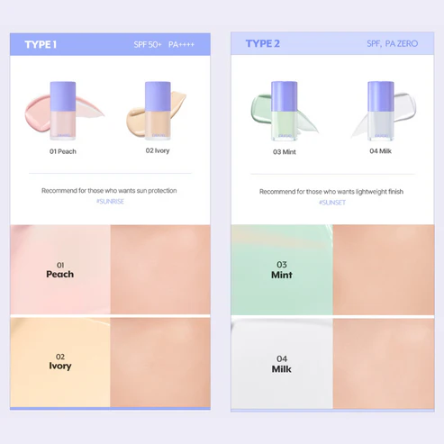 Offers 2 shades with UV protection and 2 shades for tone-up effect.