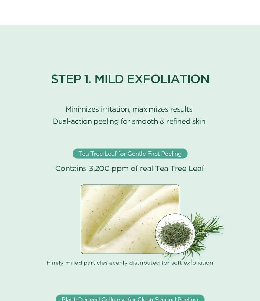 - Tea Tree Leaf and Cellulose provide a double peeling effect to remove skin impurities.