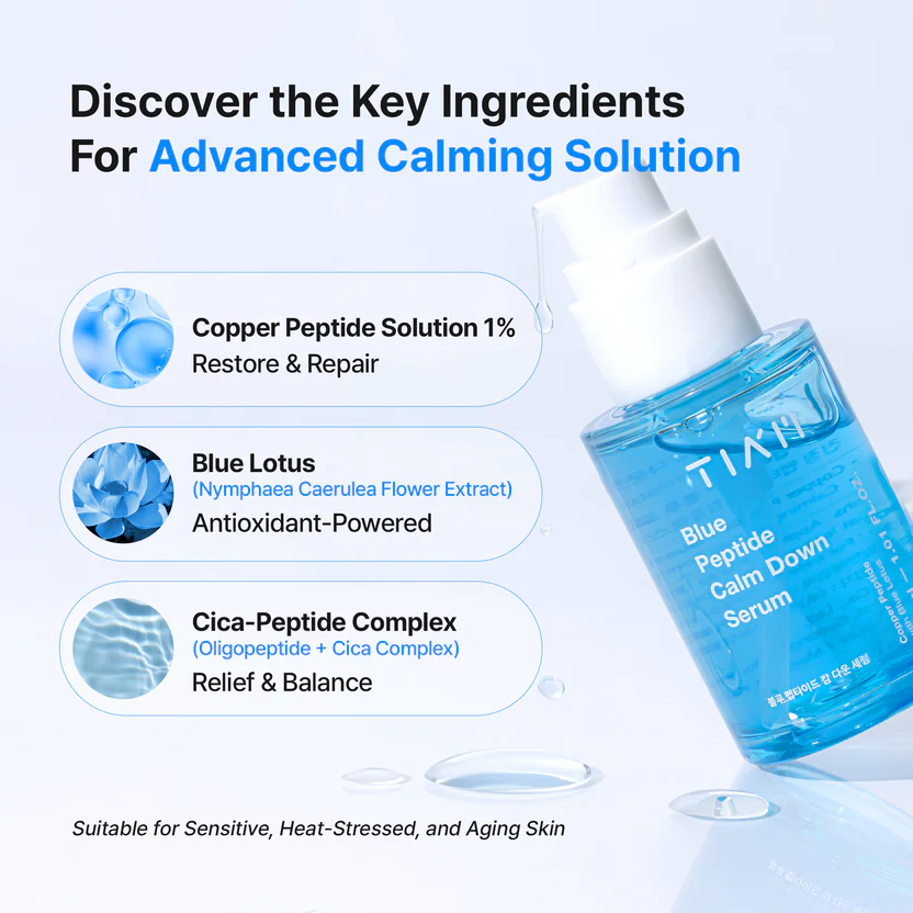 ,Whenever your skin needs to take a breather, turn to this Blue Peptide Calm Down Serum from TIA’M. It offers cooling and calming skin relief with copper peptide solution, blue lotus extract and cica-peptide complex that supports the skin barrier. The naturally blue formula promotes collagen production to minimize the appearance of fine lines and wrinkles.